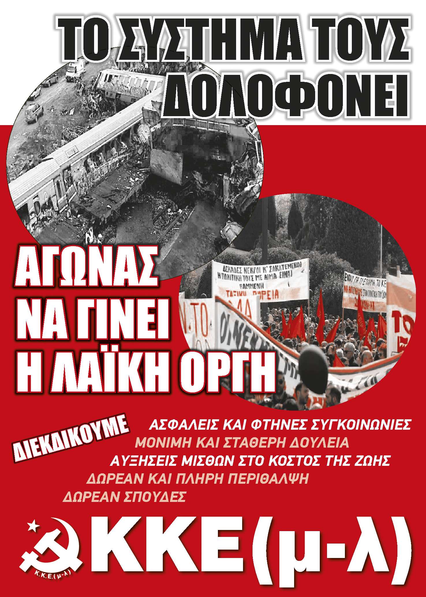 Φοβούνται τους αγώνες μας! Οι κινητοποιήσεις του λαού και της νεολαίας δημιουργούν πολιτικό πρόβλημα στις δυνάμεις του συστήματος. Η κυβέρνηση της ΝΔ τρέ-χει να μαζέψει τα ασυμμάζευτα, καταλήγοντας να εξορ-γίζει ακόμα περισσότερο. ΣΥΡΙΖΑ, ΠΑΣΟΚ και παρατρε-χάμενοι προσπαθούν να καρπωθούν εκλογικά τη λαϊκή οργή, λες και δεν πρωτοστάτησαν στην προώθηση της πολιτικής των ιδιωτικοποιήσεων, των περικοπών και της κρατικής εγκατάλειψης που οδήγησε στο έγκλημα. Ο σκυλοκαβγάς που έχουν στήσει όλοι αυτοί στοχεύει στο να αθωωθεί το σύστημα που από κοινού υπηρετούν και να μας κάνει ξανά παρατηρητές των εξελίξεων.