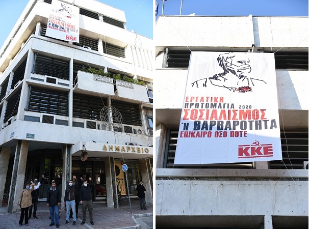 ΑΝΑΡΤΗΣΗ ΠΑΝΟ ΤΟΥ ΚΚΕ ΣΤΟ ΔΗΜΑΡΧΕΙΟ ΤΗΣ ΛΑΡΙΣΑΣ ΓΙΑ ΤΗΝ ΕΡΓΑΤΙΚΗ ΠΡΩΤΟΜΑΓΙΑ