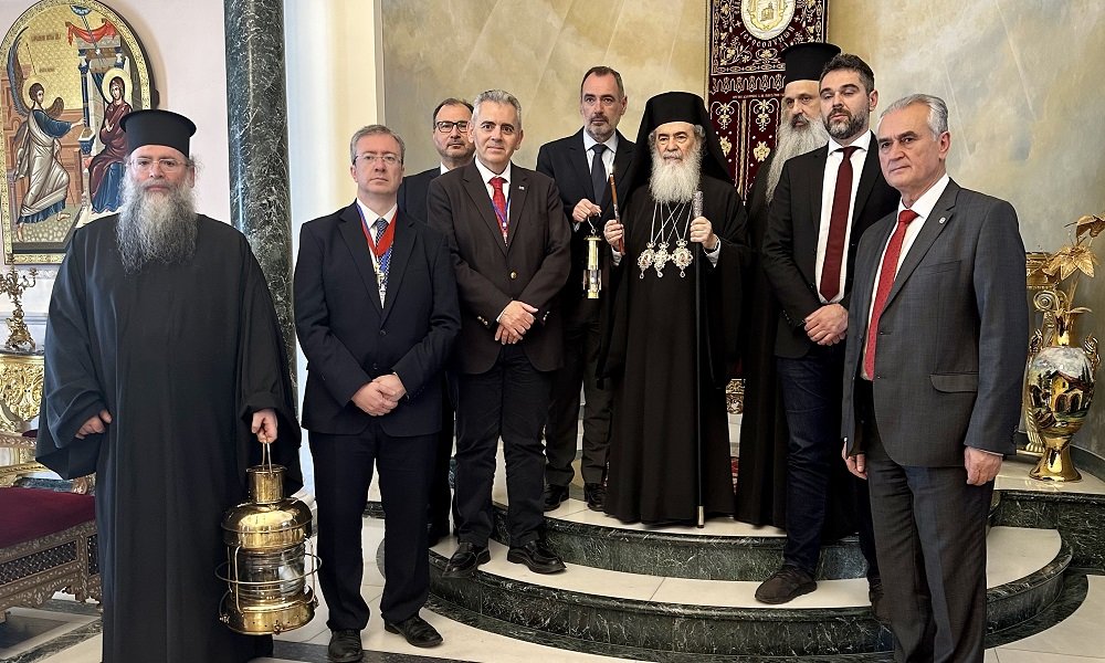 Η αντιπροσωπεία της ΔΣΟ είχε συνάντηση με τον Πατριάρχη Ιεροσολύμων κ. Θεόφιλο, ο οποίος τους ενημέρωσε για τον κομβικό ρόλο του παλαίφατου Πατριαρχείου για το στάτους κβο στα Ιεροσόλυμα και τις σοβαρές προκλήσεις που αντιμετωπίζει η Σιωνίτιδα Εκκλησία από τρομοκρατικές ενέργειες εξτρεμιστών στο Ισραήλ, που επιδιώκουν τον εκτοπισμό των χριστιανών από την Αγία Πόλη.