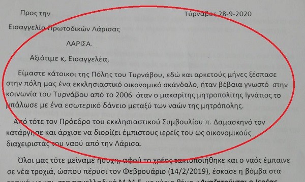 Στην επιστολή – αναφορά προς την Εισαγγελία Πρωτοδικών Λάρισας, οι “αγωνιούντες Τυρναβίτες” όπως υπογράφουν ζητούν από τον κ. Εισαγγελέα να επέμβει επισημαίνοντας ότι μπορεί να εξοφληθεί το χρέος του ναού μέσα από ρύθμιση χρέους και αν αυτό δεν είναι δυνατό για το συνολικό ποσό τότε να εκποιηθεί ένα άλλο μικρής αξίας ακίνητο.