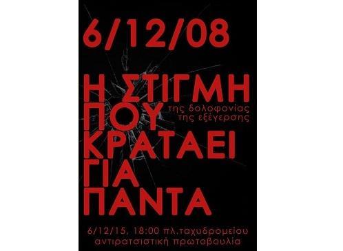 Σε συγκέντρωση και πορεία καλεί σήμερα η Αντιρατσιστική πρωτοβουλία Λάρισας με αφορμή τη συμπλήρωση 7 χρόνων από τη δολοφονία του Αλέξη Γρηγορόπουλου.