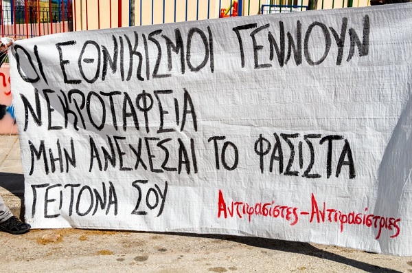 Ούτε στη Βόλου ούτε πουθενά, τσακίστε τους φασίστες σε κάθε γειτονιά”.