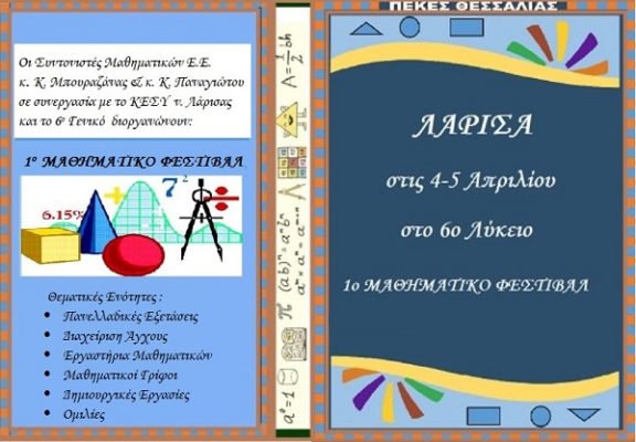 Το 1ο Μαθηματικό Φεστιβάλ Λάρισας διοργανώνεται με πρωτοβουλία των Συντονιστών Εκπαιδευτικού Έργου Μαθηματικών Θεσσαλίας σε συνεργασία με το ΚΕΣΥ ν. Λάρισας και το 6ο Γενικό Λύκειο και το 1ο Γενικό Λύκειο Λάρισας στις 4 και 5 Απριλίου στο 6ο Γενικό Λύκειο.