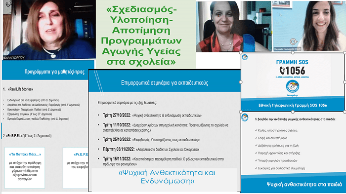 Η Υπεύθυνη Σχολικών Δραστηριοτήτων της Διεύθυνσης Πρωτοβάθμιας Εκπαίδευσης Λάρισας κ. Χατζημίχου, παρουσίασε τον σχεδιασμό υλοποίησης και αποτίμησης των Προγραμμάτων Αγωγής Υγείας στα σχολεία, παρέχοντας παράλληλα χρήσιμο εποπτικό υλικό προκειμένου να χρησιμοποιηθεί στα Προγράμματα Σχολικών Δραστηριοτήτων.