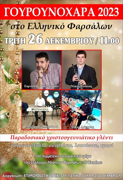 Ο Επιμορφωτικός Εκπολιτιστικός Σύλλογος κοινότητας Ευυδρίου σας προσκαλεί την δεύτερη μέρα των Χριστουγέννων (Τρίτη 26 Δεκεμβρίου) στις 11:00 το πρωί στην πλατεία στο Ελληνικό Φαρσάλων στη “ΓΟΥΡΟΥΝΟΧΑΡΑ 2023”. Ελάτε για ένα Χριστουγεννιάτικο παραδοσιακό γλέντι με παραδοσιακή ορχήστρα, γουρουνοπούλα, σουβλάκια, λουκάνικα και άφθονο κρασί.