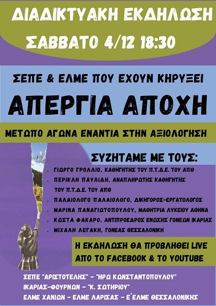 Διαδικτυακή εκδήλωση με θέμα “μέτωπο αγώνα ενάντια στην αξιολόγηση” διοργανώνουν αύριο Σάββατο 4/12 στις 18:30 οι Σύλλογοι Εκπαιδευτικών Α/βαθμιας («Αριστοτέλης», «Ηρώ Κωνσταντοπούλου», Ικαρίας- Φούρνων «Κ. Σωτηρίου» και οι ΕΛΜΕ Χανίων, Λάρισας Ε΄ ΕΛΜΕ Θεσσαλονίκη που έχουν κηρύξει απεργία – αποχή από την αξιολόγηση.