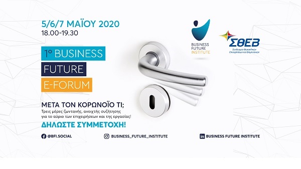 Tο 1ο Business Future e-Forum προγραμματίζεται να διεξαχθεί, από το Ινστιτούτο Επιχειρηματικού Μέλλοντος σε συνεργασία με τον ΣΘΕΒ, διαδικτυακά 5, 6 και 7 Μαΐου 2020, ώρα 18.00- 19.30.