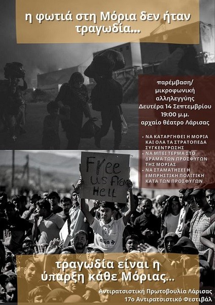 Με το μήνυμα “Η φωτιά στην Μόρια δεν ήταν τραγωδία – Τραγωδία είναι η ύπαρξη κάθε Μόριας” η Αντιρατσιστική Πρωτοβουλία Λάρισας διοργανώνει δράση αλληλεγγύης στους πρόσφυγες σήμερα Δευτέρα στις 7μμ μπροστά από το αρχαίο θέατρο Λάρισας.