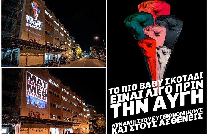 Οι συμμετέχοντες στη δράση με συνθήματα μέσω προτζέκτορα έστειλαν μήνυμα έμπρακτης αλληλεγγύης στους υγειονομικούς που χαρακτηρίζουν “ήρωες της καθημερινότητας”, αλλά και μήνυμα διεκδίκησης στην κυβέρνηση για άμεσα μέτρα στήριξη του ΕΣΥ.