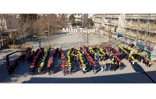 Το σύνθημα “ΜΙΛΑ ΤΩΡΑ” σχημάτισαν με τα σώματά τους όλοι οι μαθητές του 2ου Γυμνασίου Λάρισας χθες 6 Μαρτίου, που ήταν η Σχολική Ημέρα Ενάντια στην Ενδοσχολική Βία και τον Εκφοβισμό.
