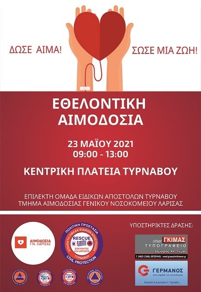 Εθελοντική αιμοδοσία της ΕΠΟΜΕΑ Τυρνάβου σε συνεργασία με την Επίλεκτη Ομάδα Ειδικών Αποστολών Λάρισας και το τμήμα αιμοδοσίας του Γενικού νοσοκομείου Λάρισας, θα πραγματοποιηθεί την Κυριακή 23/05/2021 στην κεντρική πλατεία του Τυρνάβου από 09:00 – 13:00, με σύνθημα “λίγα λεπτά σήμερα για εμάς ίσως είναι μια ζωή αύριο για κάποιον άλλον!”