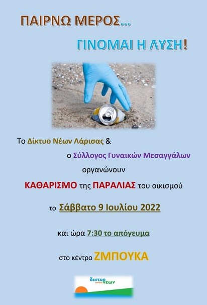Το Δίκτυο Νέων Λάρισας (Δ.Ν.Λ.) σε συνεργασία με τον Σύλλογο Γυναικών Μεσαγγάλων “ΑΡΧΑΙΑ ΦΙΛΑ” οργανώνει το Σάββατο 9 Ιουλίου καθαρισμό της παραλίας του οικισμού. Σημείο συνάντησης είναι το κέντρο “ΖΜΠΟΥΚΑ”, όπου στις 7:30 το απόγευμα θα γίνει η συγκέντρωση των εθελοντών και θα ξεκινήσει ο καθαρισμός της ακτής. Όποιος μπορεί να βοηθήσει είναι ευπρόσδεκτος!
