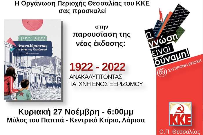 Εκδήλωση με αφορμή την έκδοση για τα 100 χρονιά από τη μικρασιατική καταστροφή για τις μικρότερες ηλικίες «1922 – 2022 ανακαλύπτοντας τα ίχνη ενός ξεριζωμού» διοργανώνει η Κομματική Οργάνωση Θεσσαλίας του ΚΚΕ.