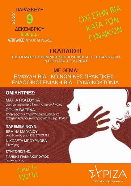 Στο πλαίσιο των δράσεων για την εξάλειψη της βίας κατά των γυναικών, η Θεματική Φεμινιστικής Πολιτικής και Ισότητας φύλων της Ν.Ε. ΣΥΡΙΖΑ -Π.Σ. Λάρισας, διοργανώνει εκδήλωση με θέμα: «Έμφυλη βία -Κοινωνικές Πρακτικές – Ενδοοικογενειακή βία -Γυναικοκτονία».
