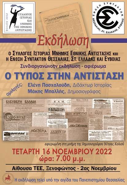 Επετειακή εκδήλωση με θέμα «Ο Τύπος στην Αντίσταση», συνδιοργανώνουν ο Σύλλογος Ιστορίας και Μνήμης Εθνικής Αντίστασης και η Ένωση Συντακτών Θεσσαλίας, Στερεάς Ελλάδας και Εύβοιας για να τιμήσουν την ημέρα της Εθνικής Αντίστασης που γιορτάζεται στην χώρα μας στις 25 Νοεμβρίου.