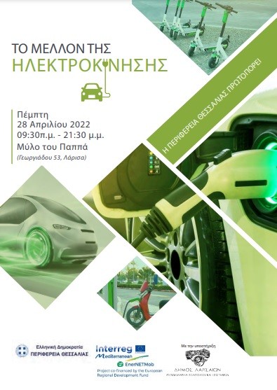 Η Περιφέρεια Θεσσαλίας στηρίζοντας την ηλεκτροκίνηση, ολοκλήρωσε με επιτυχία την συμμετοχή της στο ευρωπαϊκό έργο «Μεσογειακά Διαπεριφερειακά Δίκτυα Ηλεκτροκινητικότητας για συστήματα διατροπικών και υπεραστικών μεταφορών χαμηλών εκπομπών διοξειδίου του άνθρακα», που συγχρηματοδοτείται από το πρόγραμμα Interreg MED. Με το μήνυμα «το μέλλον της αυτοκίνησης στην Θεσσαλία είναι ηλεκτρικό» η Περιφέρεια Θεσσαλίας διοργανώνει μια ολοήμερη εκδήλωση, την Πέμπτη, 28 Απριλίου 2022 στο Μύλο του Παππά στη Λάρισα.
