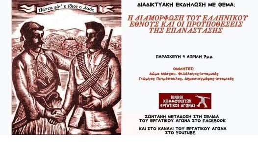 Ο Εργατικός Αγώνας, με αφορμή τη συμπλήρωση 200 χρόνων από την επανάσταση του 1821, διοργανώνει μια σειρά διαδικτυακών εκδηλώσεων. Η πρώτη από αυτές, θα γίνει την Παρασκευή 9 Απριλίου, στις 7 μ,μ με θέμα: Η διαμόρφωση του ελληνικού έθνους και οι προϋποθέσεις της επανάστασης.