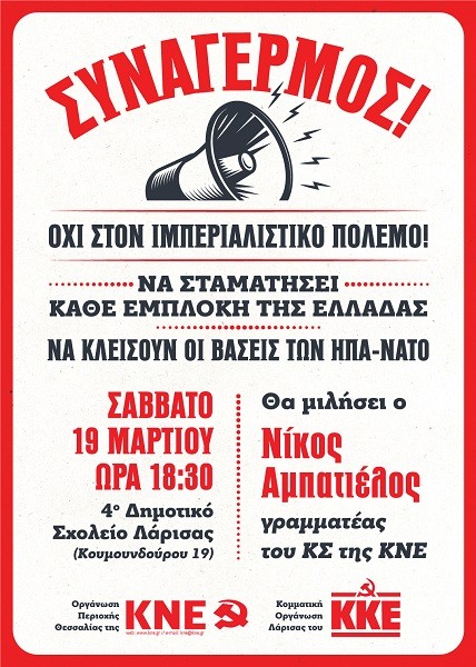 ΕΚΔΗΛΩΣΗ ΤΟΥ ΚΚΕ ΚΑΙ ΤΗΣ ΚΝΕ ΤΟ ΣΑΒΒΑΤΟ 19/3 ΣΤΗ ΛΑΡΙΣΑ ΓΙΑ ΤΟΝ ΠΟΛΕΜΟ