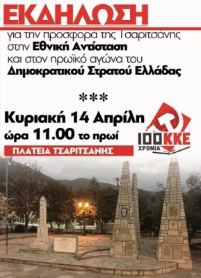Πολιτική- πολιτιστική εκδήλωση, πραγματοποιείται την Κυριακή 14 Απρίλη και ώρα 11.00 το πρωί στην πλατεία της Τσαριτσάνης. Την εκδήλωση διοργανώνει η ΚΟΒ Τσαριτσάνης του ΚΚΕ και το Παράρτημα Ελασσόνας της ΠΕΑΕΑ- ΔΣΕ για να τιμήσει την προσφορά της περιοχής.
