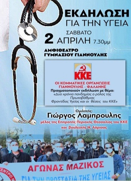 Οι Κομματικές Οργανώσεις Γιάννουλης και Φαλάνης του ΚΚΕ διοργανώνουν εκδήλωση –συζήτηση με θέμα: «Δυο χρόνια από την πανδημία η κατάσταση στην Πρωτοβάθμια Φροντίδα Υγείας η πολιτική της κυβέρνησης και οι θέσεις του ΚΚΕ», με ομιλητής τον Γιώργο Λαμπρούλη βουλευτή Λάρισας και μέλος της Επιτροπής Περιοχής Θεσσαλίας του ΚΚΕ, το Σάββατο 2 ΑΠΡΙΛΗ και ώρα 7.30 μμ στο Αμφιθέατρο του Γυμνασίου Γιάννουλης.