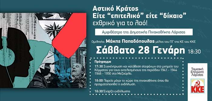 Εκδήλωση με θέμα «Αστικό κράτος: Είτε “επιτελικό” είτε “δίκαιο”, εχθρικό για τον λαό”, διοργανώνει η Τομεακή Επιτροπή Λάρισας του ΚΚΕ, το Σάββατο 28 Γενάρη, με ομιλητή τον Μάκη Παπαδόπουλο, μέλος του ΠΓ της ΚΕ του ΚΚΕ.