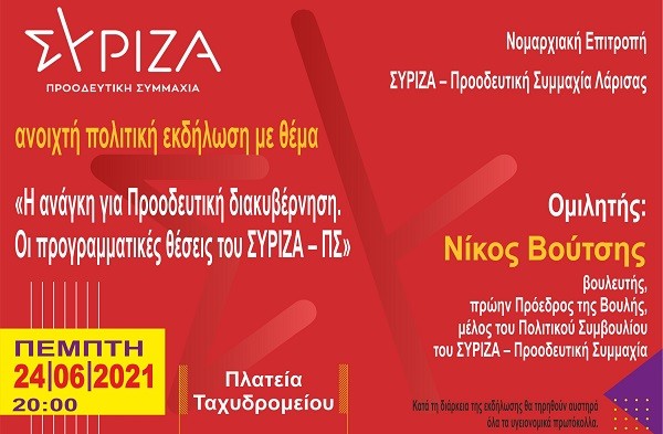 Η Νομαρχιακή Επιτροπή ΣΥΡΙΖΑ – Προοδευτική Συμμαχία Λάρισας διοργανώνει ανοιχτή πολιτική εκδήλωση την Πέμπτη 24 Ιουνίου, στις 8 το βράδυ, στην Πλατεία Ταχυδρομείου.