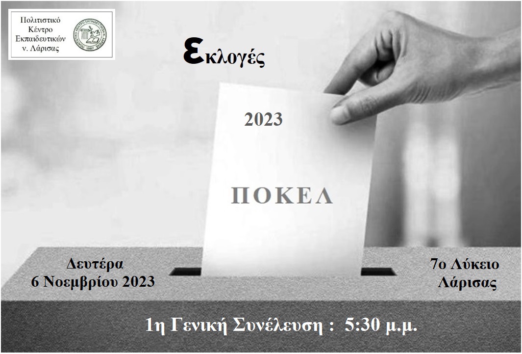 Το Πολιτιστικό Κέντρο Εκπαιδευτικών νομού Λάρισας – ΠΟΚΕΛ προκηρύσσει αρχαιρεσίες, σύμφωνα με το καταστατικό του, για την ανάδειξη Διοικητικού Συμβουλίου κι Εξελεγκτικής Επιτροπής.