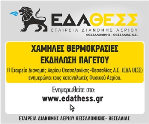 H Εταιρεία Διανομής Αερίου Θεσσαλονίκης – Θεσσαλίας Α.Ε. (ΕΔΑ ΘΕΣΣ) ενημερώνει τους καταναλωτές φυσικού αερίου ότι σύμφωνα με την Εθνική Μετεωρολογική Υπηρεσία προβλέπονται χαμηλές θερμοκρασίες και εκδήλωση παγετού.