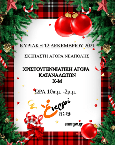 Οι Ενεργοί Πολίτες Λάρισας , με εορταστική διάθεση οργανώνουν νέα ΑΓΟΡΑ ΚΑΤΑΝΑΛΩΤΩΝ ΧΩΡΙΣ ΜΕΣΑΖΟΝΤΕΣ με προϊόντα ελληνικής παραγωγής, εξαιρετικής ποιότητας και ανταγωνιστικής τιμής, η οποία θα πραγματοποιηθεί την Κυριακή, 12 Δεκεμβρίου 2021 στη Σκεπαστή Αγορά Νεάπολης Λάρισας και ώρες 10:00-14:00.