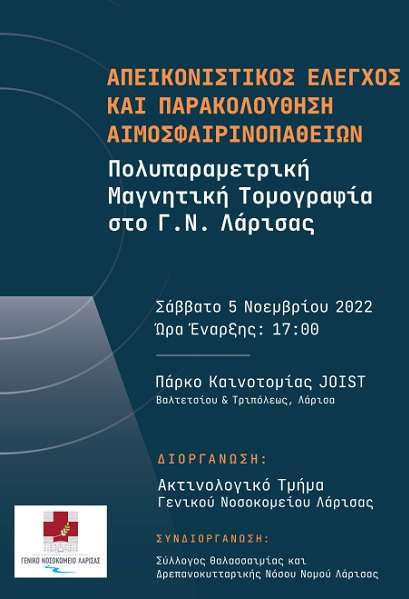 Η εκδήλωση με θέμα: «Απεικονιστικός Έλεγχος και Παρακολούθηση Αιμοσφαιρινοπαθειών με Πολυπαραμετρική Μαγνητική Τομογραφία στο Γενικό Νοσοκομείο Λάρισας» θα πραγματοποιηθεί στο Πάρκο Καινοτομίας JOIST το Σάββατο 05 Νοεμβρίου και ώρα 17:30, στην πόλη της Λάρισας και θα παρουσιαστούν οι λεπτομέρειες του προγράμματος σε ασθενείς και γιατρούς.