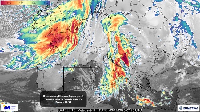 Βροχές και τοπικά ισχυρές καταιγίδες σε μεγάλο τμήμα της χώρας μας το διήμερο Πέμπτη 03/12 και Παρασκευή 04/12, θα προκαλέσει η κίνηση του βαρομετρικού χαμηλού, το οποίο βρίσκεται στην Ιταλία.