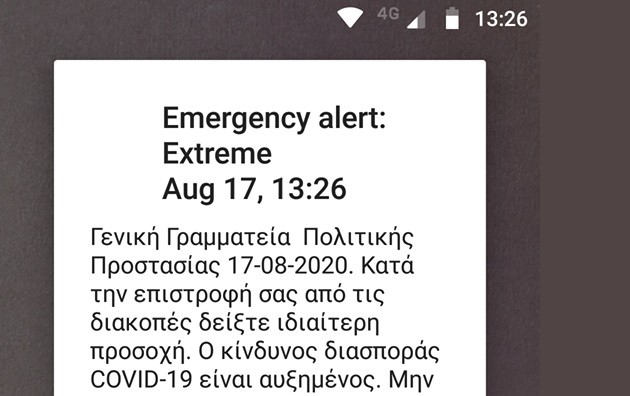 Με μαζική αποστολή η Πολιτική Προστασία έστειλε σήμερα μήνυμα μέσω του 112 για να ζητήσει από τους πολίτες που επιστρέφουν από τις διακοπές να μην έρχονται σε επαφή με ευάλωτες ομάδες.