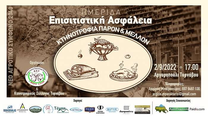 «Επισιτιστική Ασφάλεια, Κτηνοτροφία, Παρόν και Μέλλον, Νέο Αγροτικό Σύμφωνο 2040», που θα πραγματοποιηθεί την Παρασκευή 2 Σεπτεμβρίου 2022 και ώρα 17:00μ.μ. στον προαύλιο χώρο του Ιερού Ναού Ζωοδόχου Πηγής στο Αργυροπούλι Τυρνάβου.