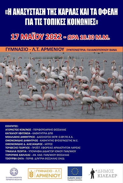 Την Τρίτη 17/5/2022 και ώρα 18:30, το Γυμνάσιο-ΛΤ Αρμενίου συνδιοργανώνει με την Περιφέρεια Θεσσαλίας, το Περιφερειακό ταμείο Europe Direct και τον Δήμο Κιλελέρ, στον χώρο του σχολείου επιστημονική-ενημερωτική ημερίδα με θέμα την ανασύσταση της λίμνης Κάρλας και τα οφέλη για τις τοπικές κοινωνίες. Η εκδήλωση διοργανώνεται στο πλαίσιο σχετικού περιβαλλοντικού προγράμματος.