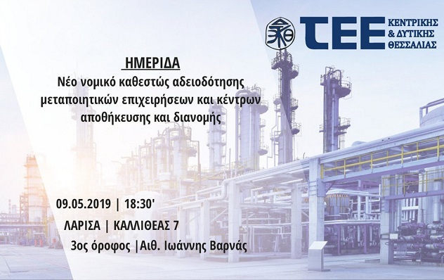 Το Περιφερειακό Τμήμα Κεντρικής & Δυτικής Θεσσαλίας του ΤΕΕ διοργανώνει ενημερωτική ημερίδα με θέμα: « Νέο θεσμικό πλαίσιο αδειοδότησης μεταποιητικών επιχειρήσεων και κέντρων αποθήκευσης και διανομής» την Πέμπτη 9 Μαΐου 2019, και ώρα 18:30 , στο ΤΕΕ, (Καλλιθέας 7, αίθουσα «Ιωάννης Βαρνάς», 3ος όροφος).