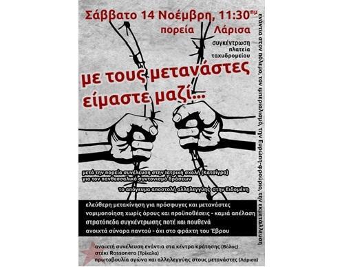 Το Σάββατο 14/11 στις 11.30 π.μ. στην πλατεία Ταχυδρομείου θα πραγματοποιηθεί συγκέντρωση και πορεία αλληλεγγύης με συμμετοχές αλληλέγγυων συλλογικοτήτων από όλη τη Θεσσαλία.