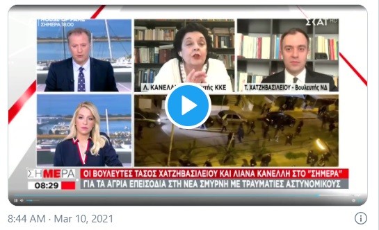 Ένταση επικράτησε στο πάνελ πρωινής εκπομπής του Σκάι για τα όσα συνέβησαν το βράδυ της Τρίτης στη Νέα Σμύρνη, με τον Δημήτρη Οικονόμου να «κόβει» στον αέρα την Λιάνα Κανέλλη, επειδή δήθεν ενοχλήθηκε από το γεγονός ότι η βουλευτής του ΚΚΕ μετέφερε στη συζήτηση τη φράση κάποιων αστυνομικών “πάμε να τους τους γαμ@@@, να τους σκοτώσουμε”.