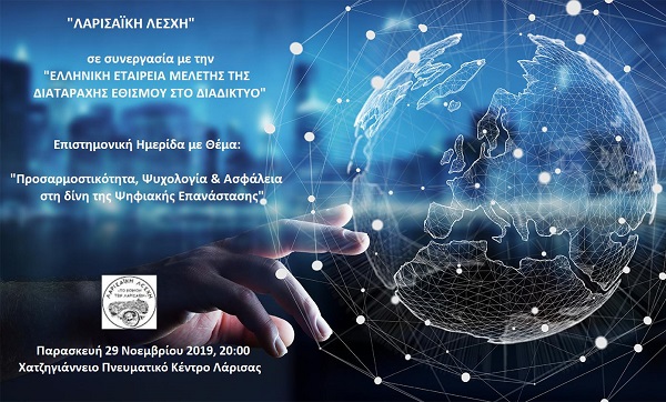 Η “Λαρισαϊκή Λέσχη”, σε συνεργασία με την “Ελληνική Εταιρία Μελέτης τη Διαταραχής του Εθισμού στο Διαδίκτυο” και τη “Διεύθυνση Δίωξης Ηλεκτρονικού Εγκλήματος” στο πλαίσιο προσπάθειας ευαισθητοποίησης και ενημέρωσης των μελών της αλλά και των πολιτών της Λάρισας, για σημαντικά ζητήματα που αφορούν το νέο ψηφιακό περιβάλλον, έχει την τιμή να σας προσκαλέσει στην Ημερίδα με θέμα: