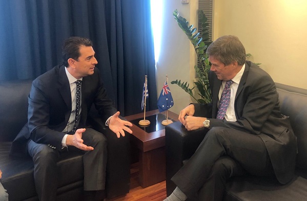 Για τις προοπτικές ανάπτυξης των οικονομικών και εμπορικών σχέσεων Ελλάδας – Αυστραλίας, με επίκεντρο τον αγροτικό τομέα, συζήτησαν κατά τη συνάντηση τους την Τρίτη (3/9/2019) ο Υφυπουργός Αγροτικής Ανάπτυξης και Τροφίμων Κώστας Σκρέκας με τον Επιτετραμμένο της Πρεσβείας της Αυστραλίας στην Αθήνα, Jon Philip.