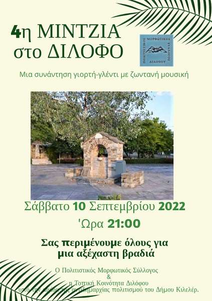 Το Σάββατο 10 Σεπτεμβρίου 2022 και ώρα 9 μ.μ., θα πραγματοποιηθεί η τέταρτη ΜΙΝΤΖΙΑ στην πλατεία του χωριού, η οποία θα διοργανωθεί από τον Πολιτιστικό – Μορφωτικό Σύλλογο και την Τοπική Κοινότητα Διλόφου , υπό την αιγίδα της αντιδημαρχίας πολιτισμού του Δήμου Κιλελέρ.