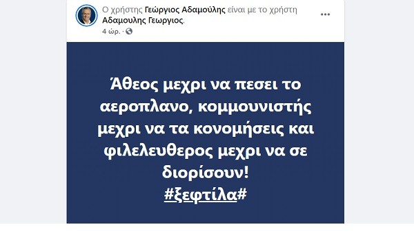 Χαρακτηριστική και η ανάρτηση «γαλάζιου» πολιτευτή, με τον Γ. Αδαμούλη να σχολιάζει… φωτογραφικά ως εξής: “Άθεος μέχρι να πέσει το αεροπλάνο, κομμουνιστής μέχρι να τα κονομήσεις και φιλελεύθερος μέχρι να σε διορίσουν! #ξεφτίλα#”, την ώρα που τα σχόλια περί επιτομής της πολιτικής ξεφτίλας και περί παλιάς καραβάνας που γλύφει εκεί που έφτυνε ακολουθούσαν την ανάρτησή του.