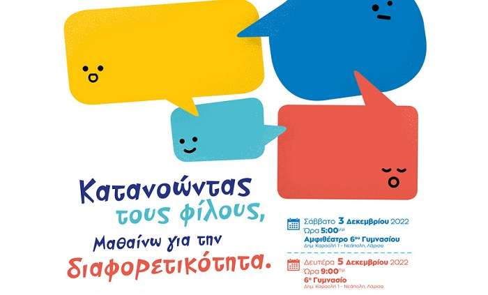 Το Σάββατο 3 Δεκεμβρίου 2022 θα πραγματοποιηθεί ημερίδα στο αμφιθέατρο του 6ου Γυμνασίου (ώρα 17:00) με θέμα ”Μαθαίνω την διαφορετικότητα”. Αντικείμενο της ημερίδας θα είναι η κατανόηση της έννοιας της αναπηρίας και της διαφορετικότητας καθώς και οι ιδιαίτερες μαθησιακές δυσκολίες και ανάγκες των ατόμων με αναπηρία.