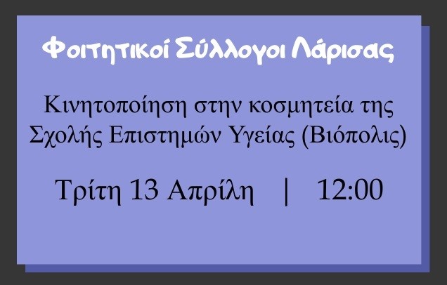 Κινητοποίηση στην κοσμητεία της Σχολής Επιστημών Υγείας (Βιόπολις) διοργανώνουν σήμερα Τρίτη στις 12 μ. οι φοιτητικοί σύλλογοι του Πανεπιστημίου Θεσσαλίας θέλοντας για μια ακόμη φορά να αναδείξουν τα τεράστια προβλήματα λόγω των κλειστών πανεπιστημίων με αποφάσεις της κυβέρνησης αλλά και για να εκφράσουν την αντίθεσή τους στο νόμο Κεραμέως.