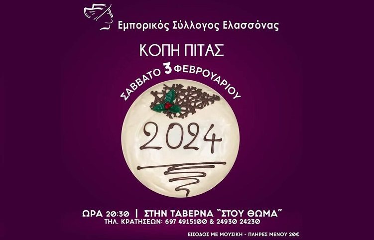 Η Πρόεδρος και τα μέλη του Διοικητικού Συμβουλίου του Εμπορικού Συλλόγου Ελασσόνας, σας προσκαλούν να τιμήσετε με την παρουσία σας, την κοπή της βασιλόπιτας του Συλλόγου, σε μια βραδιά, που θα πραγματοποιηθεί το Σάββατο 3 Φεβρουαρίου 2024 και ώρα 20:30 στην ταβέρνα ΄΄Στου Θωμά’’.