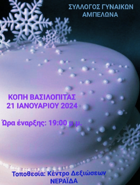Ο Σύλλογος Γυναικών Αμπελώνα καλεί τα μέλη και τις φίλες του Συλλόγου να παραβρεθούν στην καθιερωμένη πλέον ετήσια εκδήλωση Κοπής της Βασιλόπιτας ,στις 21 Ιανουαρίου 2024 στο Κέντρο Δεξιώσεων “Νεράιδα”,