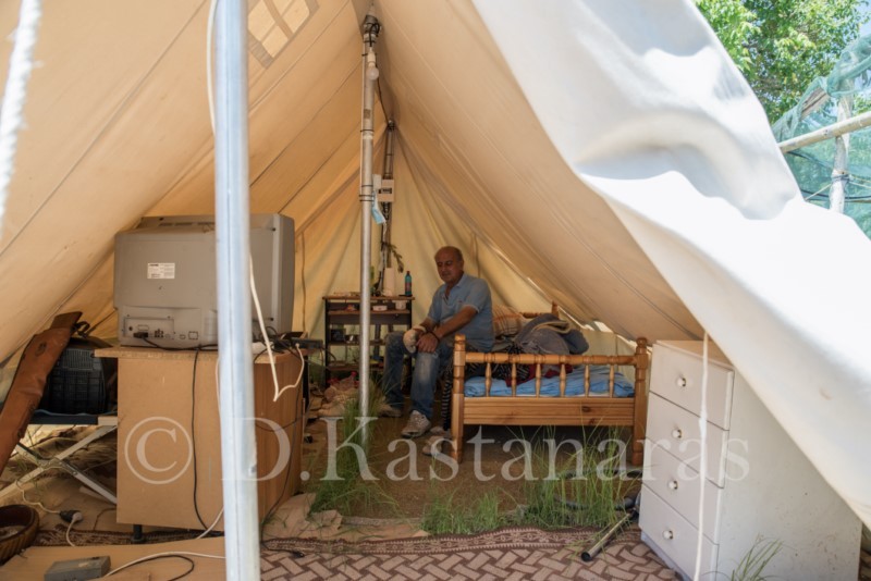 Ο κ. Αχιλλέας ζει ακόμη στην σκηνή, «το βράδυ είναι κάπως καλά αλλά όλη την υπόλοιπη ημέρα βράζει ο τόπος εκεί μέσα, να έλα να δεις και μόνος σου. Ούτε ένα λεπτό δεν θα αντέξεις», μου λέει ανοίγοντας την σκηνή για να περάσω και συνεχίζει «ας έρθουν αυτοί να καθίσουν εδώ έστω για μία ημέρα να δω μετά τι θα πουν. Πολλές φορές κοιμάμαι στο αυτοκίνητο και ειδικά με τις βροχές που έριξε…».