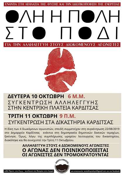 Δηλώνουν τη συμπαράστασή στους 4 διωκόμενους της Καρδίτσας που δικάζονται στις 11 Οκτώβρη 2022 στην Καρδίτσα στις 9 το πρωί -λόγω συμπλήρωσης του ωραρίου λειτουργίας των δικαστηρίων η δίκη διακόπηκε στις 4/10 για την Τρίτη 11 Οκτωβρίου- λόγω της συμμετοχής τους σε κινητοποίηση κατοίκων στις 22/8/2019 στο δημαρχείο της πόλης ενάντια στην παραχώρηση σε «επενδυτική» εταιρεία δασικών εκτάσεων για τις εργασίες εγκατάστασης ανεμογεννητριών στα Άγραφα.
