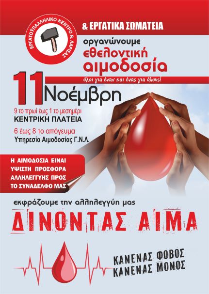 Το Εργατικό Κέντρο Ν. Λάρισας με τα Σωματεία της δύναμης του, σε συνεργασία με το Γενικό Νοσοκομείο Λάρισας θα πραγματοποιήσουν την Πέμπτη 11 Νοεμβρίου 2021, εθελοντική αιμοδοσία στην Κεντρική Πλατεία της Λάρισας το πρωί από τις 9:00 έως τις 13:00 το μεσημέρι, το απόγευμα στην αιμοδοσία του Νοσοκομείο από τις 18:00 έως τις 20:00. Συνεχίζουμε αυτή την προσπάθεια στα πλαίσια τις αλληλεγγύης σε αυτούς τους δύσκολους καιρούς της πανδημίας του κορωνοϊού, με όλα τα μέσα ατομικής προστασίας, για την τράπεζα αίματος του ΕΚΝΛ, υπάρχει μεγάλη ανάγκη από αίμα.