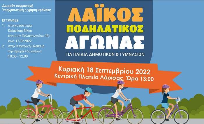 Ο Ποδηλατικός Αθλητικός Σύλλογος “ΠΗΝΕΙΟΣ” και η Cycling Hellas συνδιοργανώνουν με τον Δήμο Λαρισαίων λαϊκό ποδηλατικό αγώνα για παιδιά δημοτικών και γυμνασίων σχολείων, την Κυριακή 18 Σεπτεμβρίου 2022 στις 13:00 στο δρόμους του κέντρου της Λάρισας (Κεντρική Πλατεία).