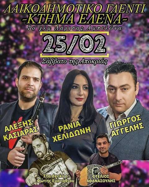Λαϊκό-δημοτικό γλέντι μέχρι πρωίας με τον Αλέξη Κασιάρα, τη Ράνια Χελιδώνη, τον Γιώργο Αγγέλη και τον Στέλιο Αθανασούλη.